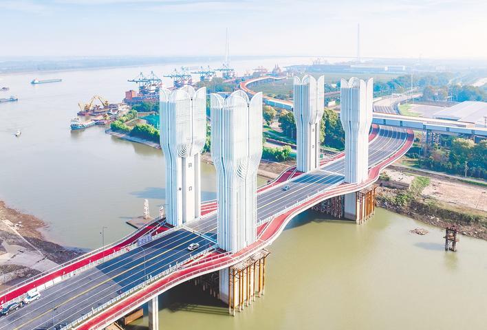 湖北日报记者看到,水面上有四根白色的塔柱伸向天空。整体造型像一棵细长的树,给人一种艺术感。大桥两侧各有6条车道,两侧设有人行道和车道,将人车分开。控制中心安装在桥下,24小时监控桥上车辆和行人的安全。