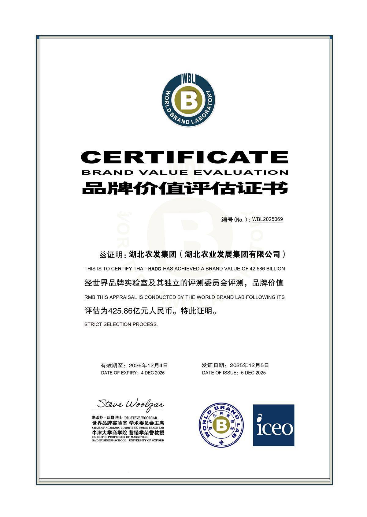 湖北日报讯(记者崔玉宇、记者陈宇、通讯员杨树军、通讯员朱孟金)近日,国际权威机构世界品牌研究所公布评价结果,湖北省农发集团品牌价值达4258.6万元。湖北省农发集团成立短短四年时间,品牌价值从零提升到卓越,标志着省属国有企业品牌建设已迈向价值链高端。国际权威机构世界品牌研究院公布,湖北省农业发展集团品牌价值达425.86亿元。 2021年底成立的湖北省农发集团,确立了做强企业的品牌战略,正在完善“湖北省农发”的金字招牌。集团制定了《公司《湖北农产品强国行动计划》构建“1+N+X”品牌生态圈,以主品牌“湖北农产品”为核心,联合湖北粮油集团、湖北粮油食品进出口集团、湖北盐业集团等旗下品牌,盘活“云和”、“竹花香”、“胡”、“零”等产品品牌活力,“一号猪”、“楚”等服务品牌目前,两大主打产品“楚湖香”、“云禾”品牌价值分别达到105.42亿元、71.8亿元,打造自主品牌、共建地方品牌。湖北省农发集团将创新“政府引导、国企主导、民企合作”模式,深度参与“江汉大米”全产业链, “钱江龙虾”、“随州蘑菇”等,打造集优质良种选育、生态种养、精深加工为一体的一体化产业发展平台,打造江汉大米集团、小龙虾集团、香菇集团等地方级区域公共品牌建设。专注于“仙桃鳗”良种培育研发,成立了湖北鳗业集团、湖北鳗业技术研究院,改造现代化10000平方米智能养殖工厂,打造全国最大的鳗鱼良种培育基地。湖北省农牧发展集团秋香黑猪肉是向港澳企业供应生猪、生牛的生力军,市场占有率达95%以上。我们为最大的市场份额感到自豪。今年累计出口港澳的奶牛数量达到13655头。质量稳定,产能充足,实力雄厚巩固粤港澳大湾区优质猪肉市场地位。粮食石油部进出口集团负责内地向香港供应易腐烂货物。截至目前,我们已运输生猪、牛超过1000万头,家禽1亿多只,鸡蛋3亿多个。香港居民亲切地称其为“香港菜篮子”。 2025年,湖北省农发集团计划利用渠道优势,推出新型农业生态连锁品牌“吹傲天”。目前,已开设26家线下门店,加上与线上商城一体化运营,公司正在逐步构建全球销售网络。品牌引领,“巨轮”扬帆远航。 2025年起,集团总资产将突破1000亿元,营业利润突破700亿元,同比分别增长30%和31%,分别。在“中国企业500强”中排名第449位,在“中国农业企业500强”中排名第27位。